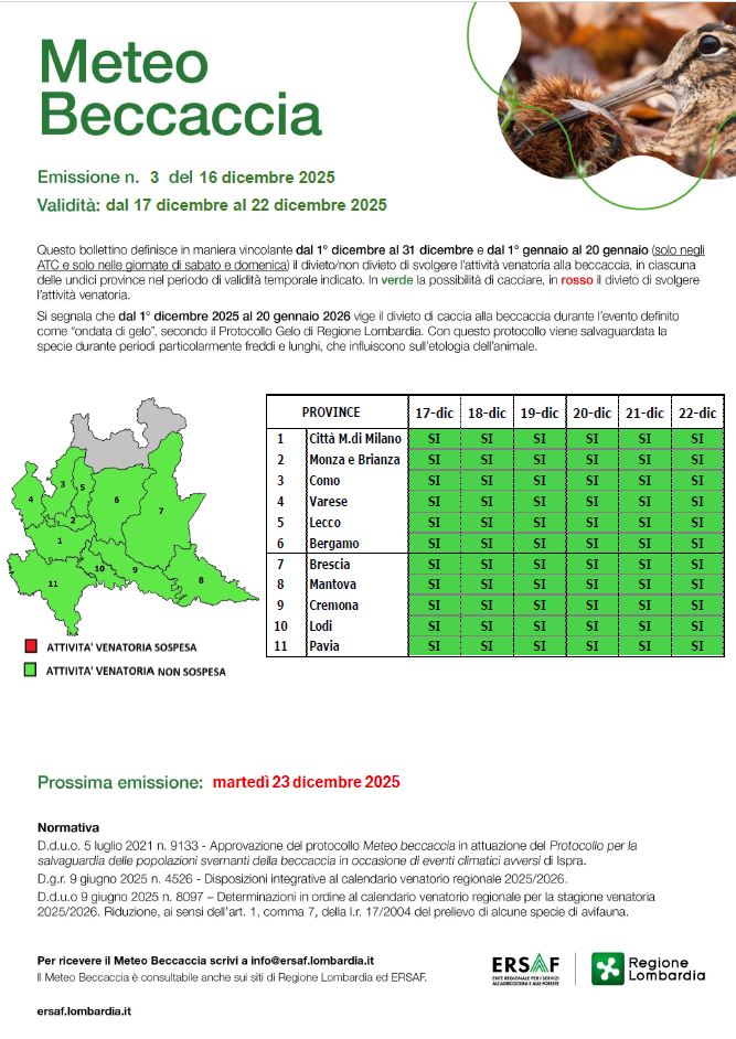 Il protocollo “Meteo Beccaccia” (approvato con D.d.u.o. n. 9133 del 5 luglio 2021) è stato istituito per tutelare le popolazioni svernanti della Beccaccia in Regione Lombardia (esclusa la Provincia di Sondrio) in caso di eventi climatici avversi, definiti “Ondate di gelo.”