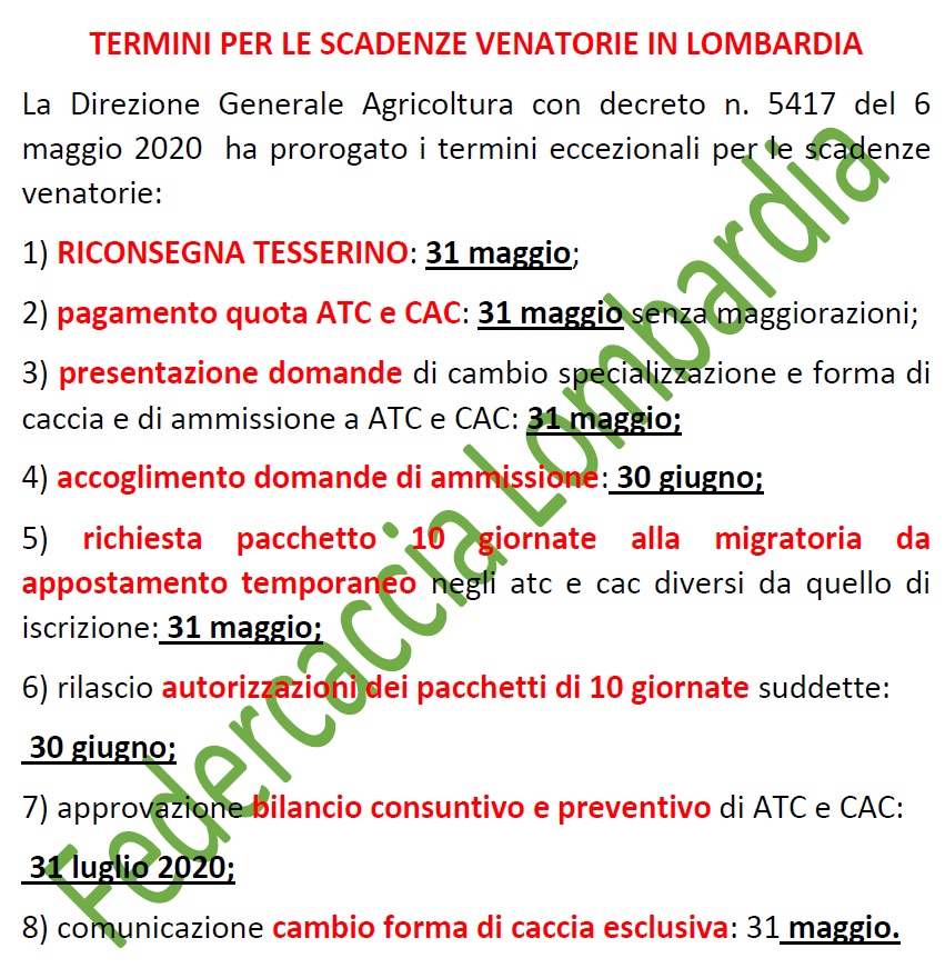Scarica il Decreto n. 5417 del 6 Maggio 2020 avente ad oggetto: “ D.G.R. N. 2942 DEL 16 MARZO 2020. D.G.R. XI/3031 DEL 6 APRILE 2020. ULTERIORI DETERMINAZIONI IN ORDINE ALLA RESTITUZIONE DEL TESSERINO VENATORIO AI SENSI DELL’ART. 22 C. 6 L.R. 26/93 E ALTRI ADEMPIMENTI DI CUI ALLA L.R. 26/93”.