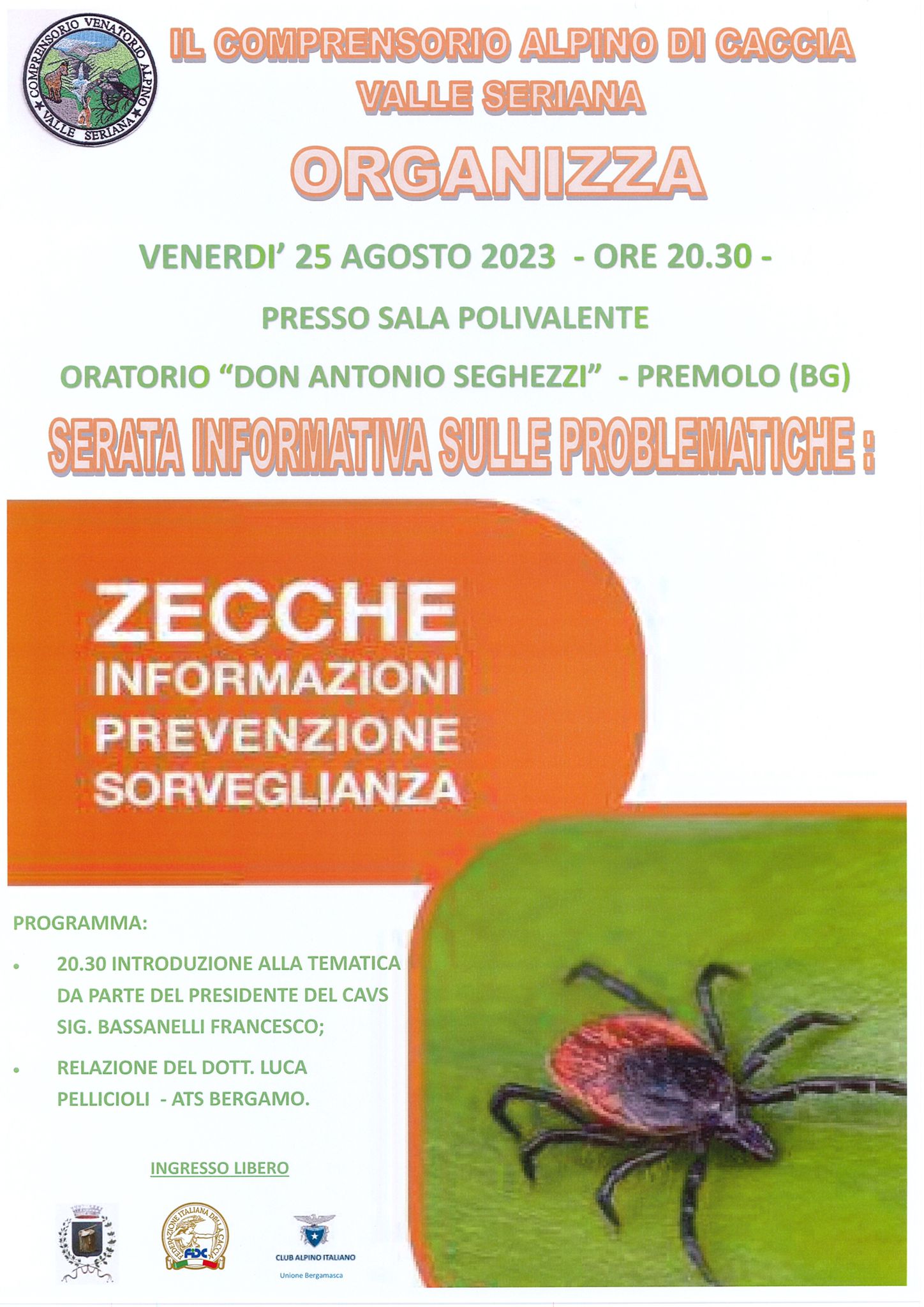L’appuntamento è in programma venerdì 25 agosto alle 20:30 presso il centro polivalente Don Antonio Seghezzi di Premolo. Ci sarà un’introduzione all’argomento da parte del Presidente del Comprensorio Francesco Bassanelli e la relazione di Luca Pellicioli di Ats Bergamo. La serata è patrocinata da Federcaccia, dal Comune e dal Cai.