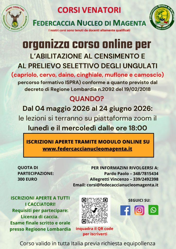 Il ruolo del cacciatore moderno evolve: non più solo fruitore, ma custode attivo degli equilibri naturali. Con questo spirito, il Nucleo Federcaccia di Magenta “Eligio Colombo” annuncia l’apertura delle iscrizioni per il nuovo Corso di Abilitazione al Prelievo Selettivo degli Ungulati, che si terrà tra maggio e giugno 2026.